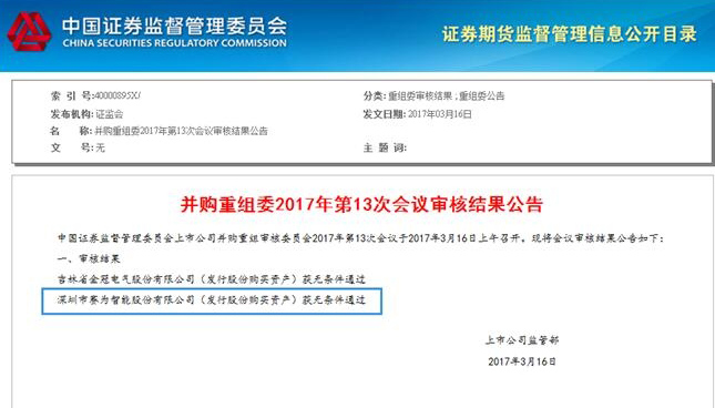 3月16日晚,证监会发布公告,证监会并购重组委第13次会议于3月16日上午召开,根据审核结果,星空(中国)智能(300044)发行股份购买资产获无条件通过。